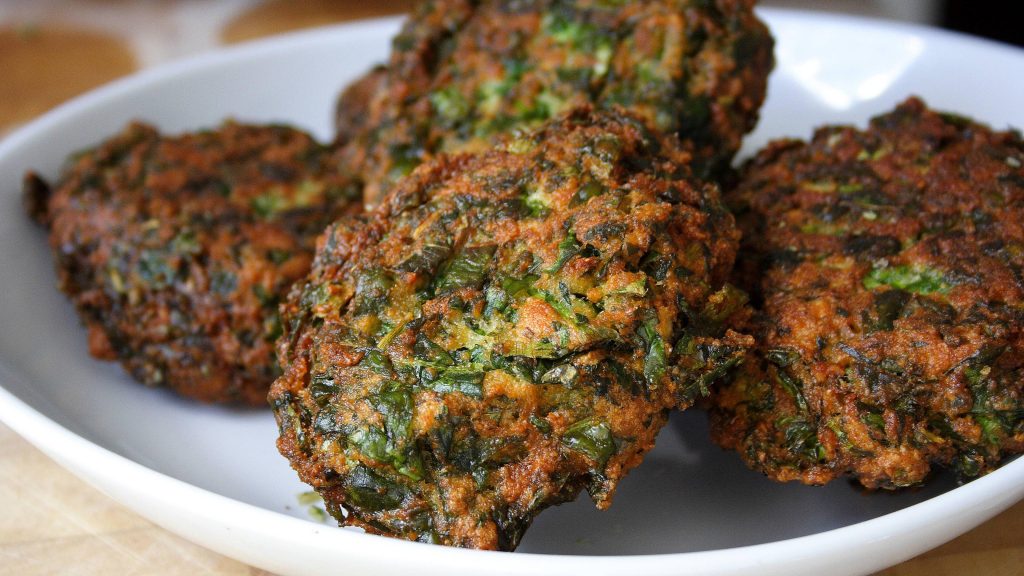 4 kugler frossen spinat (elller grønkål, optøet og knuget helt fri for væde, eller et bundt persille eller 2 håndfulde babyspinat)